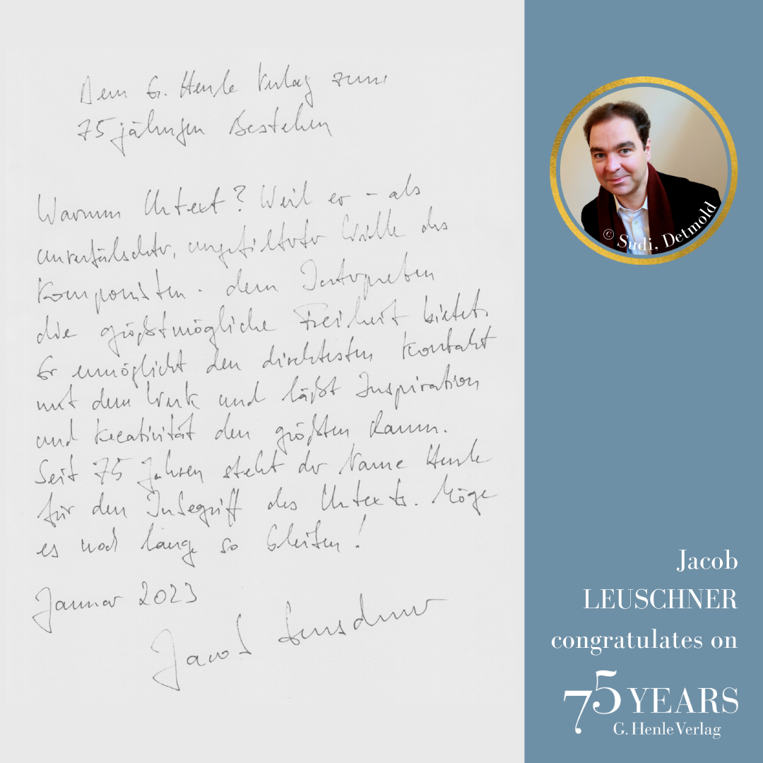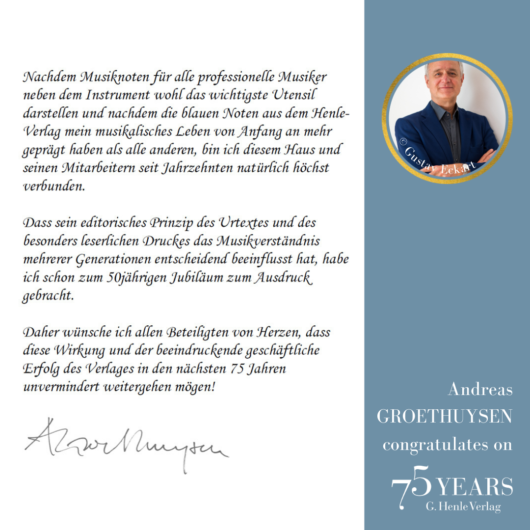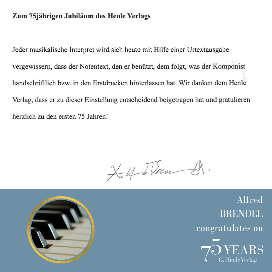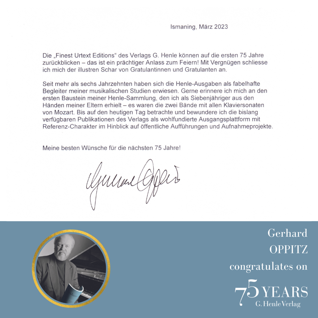 In October 1948, a difficult period, the music-loving industrialist Günter Henle founded his music publishing house. His passion was “Urtext”: correct, unadulterated and beautiful editions of great works of classical music. Today we can look back on a great success story: 75 years of “Finest Urtext Editions”. Thus throughout 2023 we will be celebrating Urtext and our special anniversary. The highlight will be a large gala concert with numerous internationally renowned artists in Munich’s Prinzregententheater at the beginning of November. Come and celebrate with us!