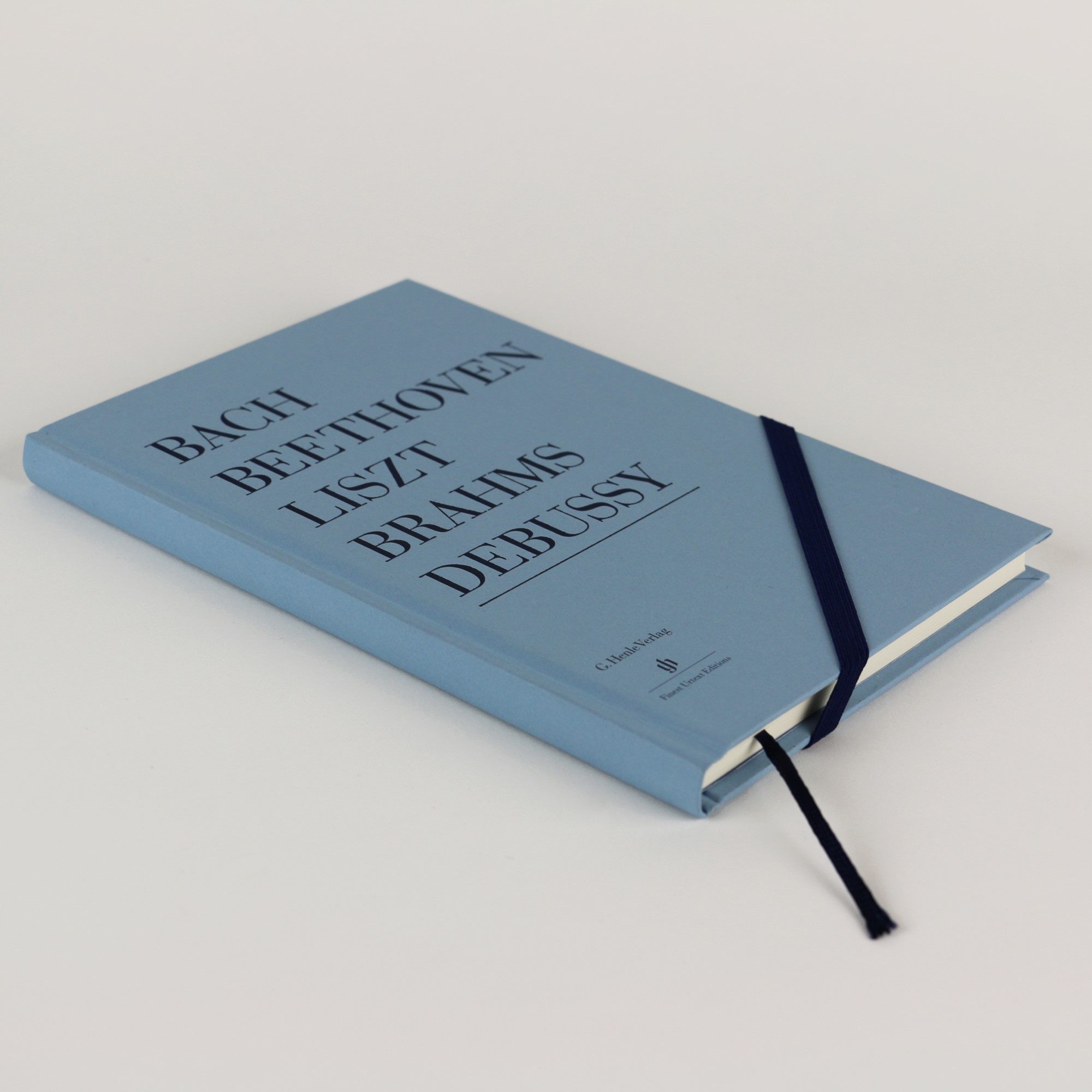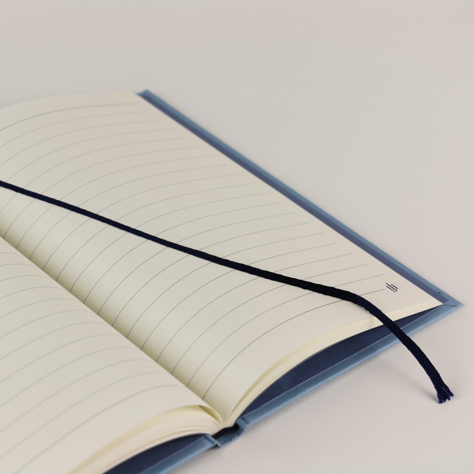 Notebook with light blue cover in Henle-design. Handy format 135 x 205 mm, with 176 lined inner pages of yellowish-white paper. Equipped with practical ribbon place-marker and rubber band fastener, both in dark blue. Durable thread stitching with headband in hard cover binding.